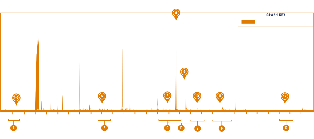This total ion chromatogram (TIC) using gas chromatography-mass spectrometry (GC-MS) is an analytical look at the congeners, or flavor molecules, in your Roaming Man Straight Tennessee Whiskey Special Ed. 7 before and after aging. This chromatogram is your whiskey’s scientific “fingerprint.” As evident in the graph, the chemical composition changes during maturation, creating complexity and texture.
