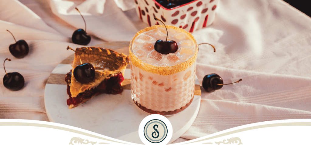 1.5 oz. hrv 1 oz. bday cake .5 oz. simple syrup 1.5 oz. tart cherry juice graham cracker crumbs cherry combine ingredients in shaker with ice, shake and strain over ice glass rimmed with graham cracker crumbs) cherry garnish lowball